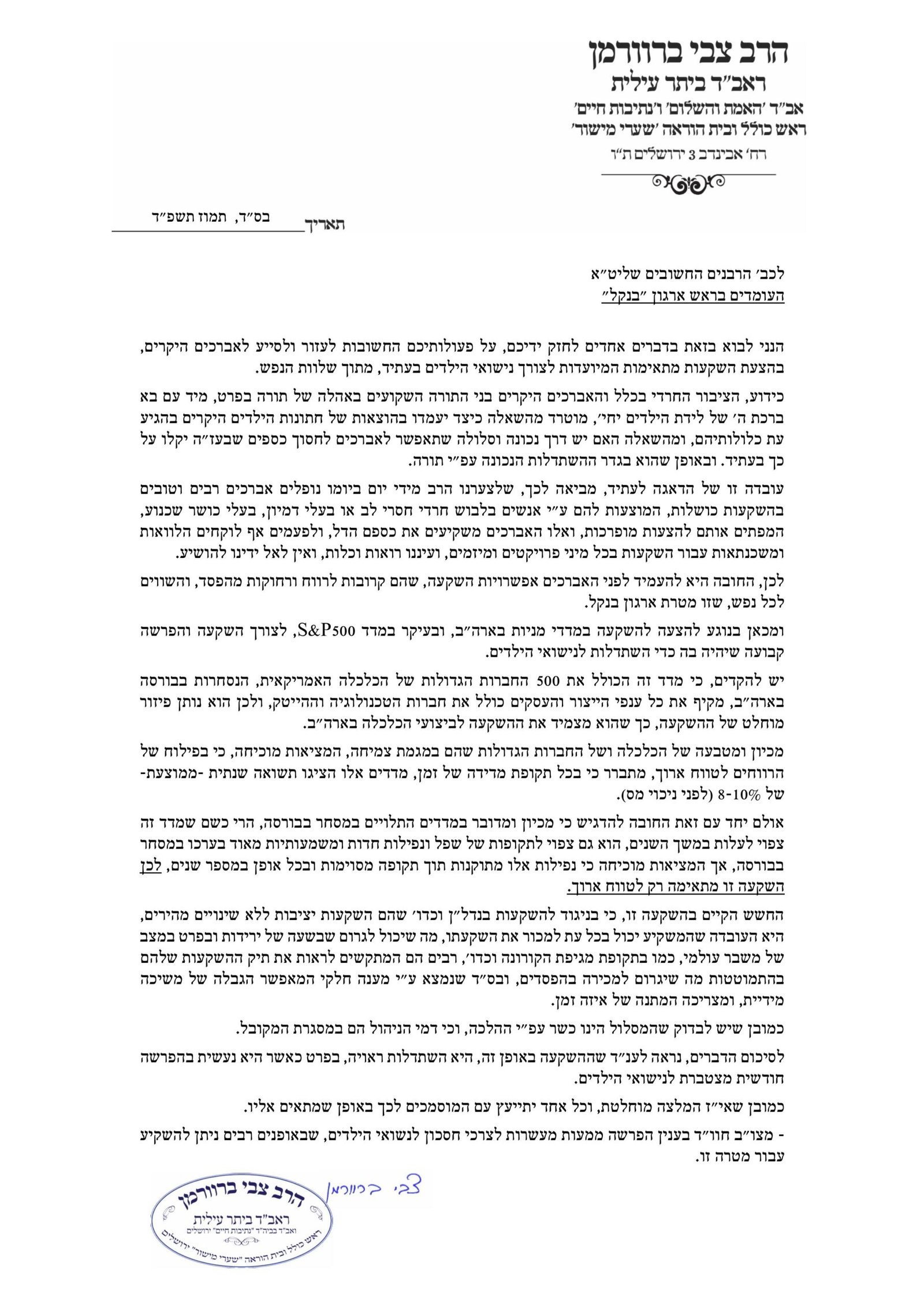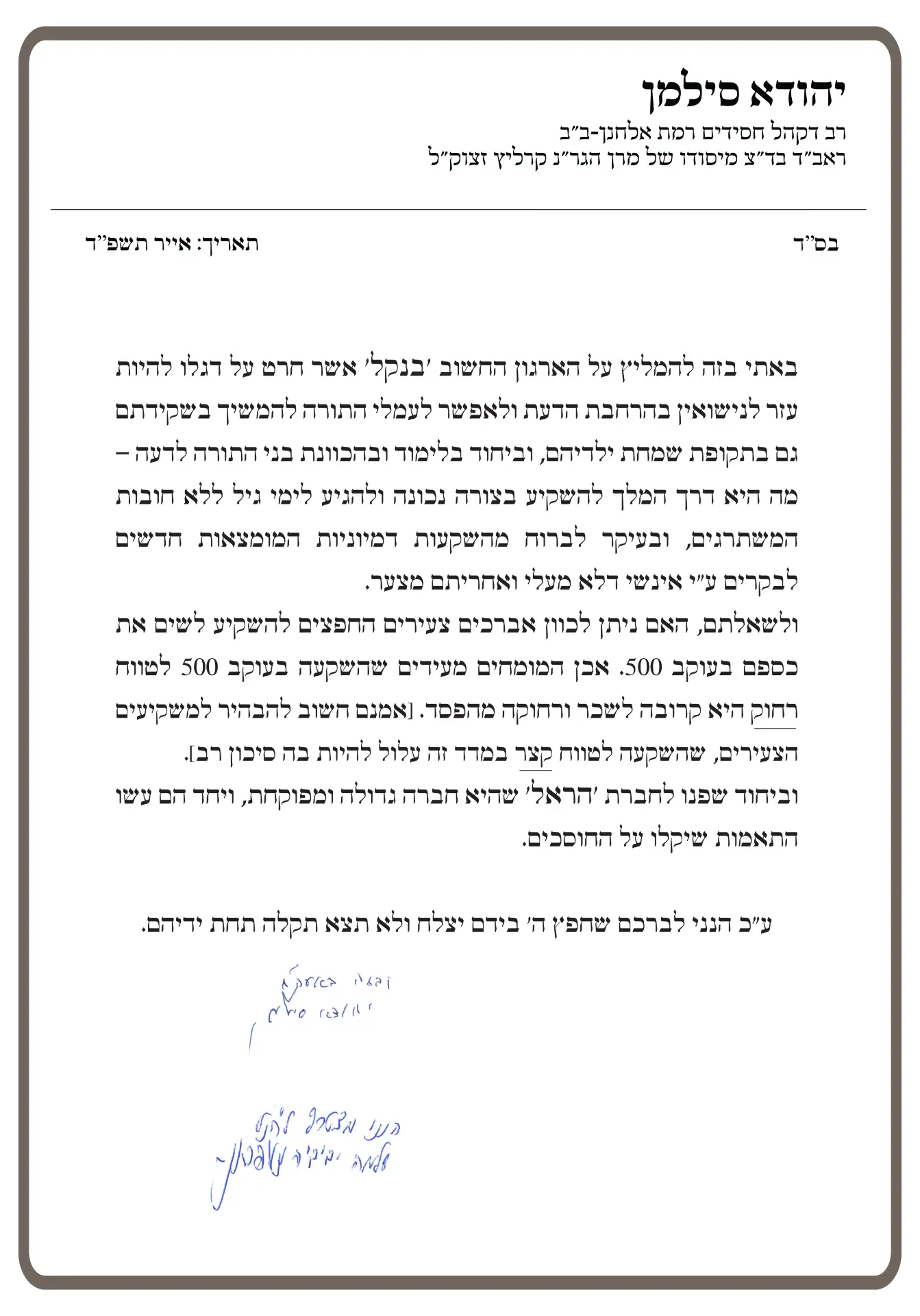 בהשקעה לטווח של 10 שנים ומעלה במסלול המדובר, הסיכון נמוך באופן יחסי, ובגלל זה הוא זכה לתמיכתם החמה של גדולי הדיינים שליט"א.